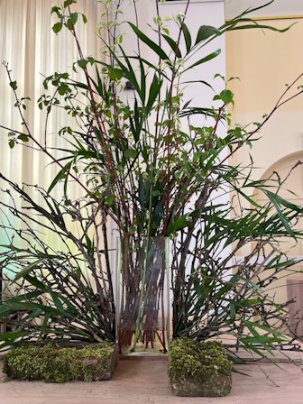 De basisschikking is als een opengeslagen waaier, gemaakt met takken van onze oude appelboom. Het is een verwijzing naar het verhaal van Adam en Eva in het paradijs.