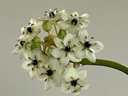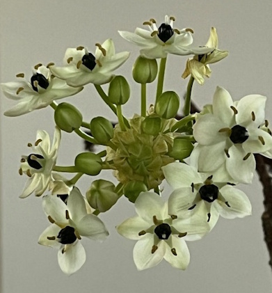In het midden van de waaier met appeltakken en grassen, drie zuidenwindlelies.