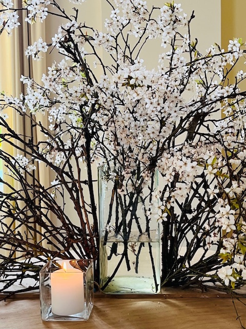 In de waaier van takken bloeiende prunustakken als teken van de naderende lente.