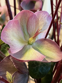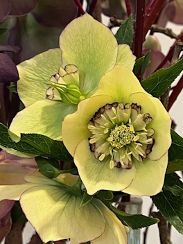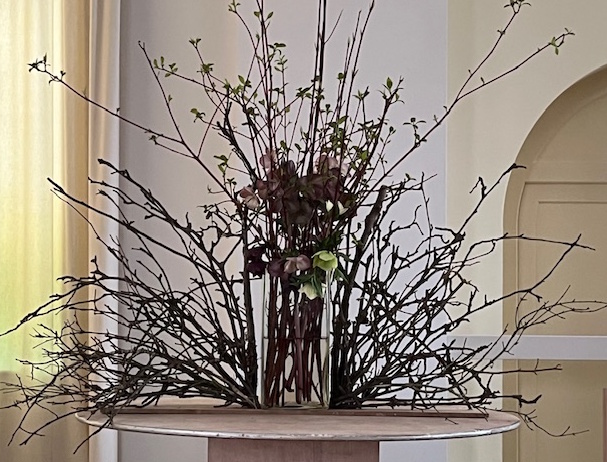 Tussen de takken bloemen van de helleboris oftewel kerstroos, die op dit moment prachtig bloeit. Het verwijst naar de geboorte van Christus. De paarse kleur herinnert ons aan de lijdenstijd, voorafgaand aan Pasen