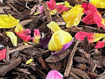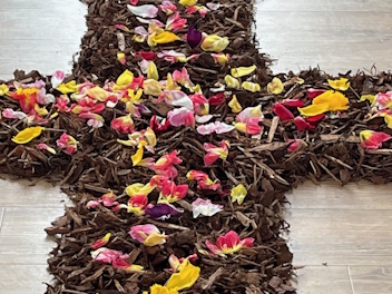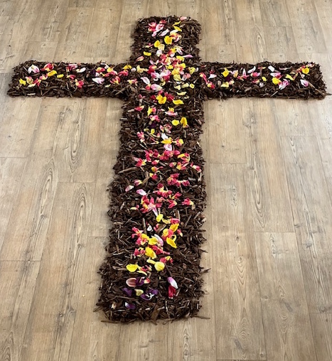 Op het kruis, uitgestrooide bloemblaadjes van de tulp, als stille getuigen van gebed, in kleuren van de regenboog.