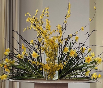 Een feestelijke schikking met narcissen in de waaier van de Geest, die als het ware het nieuwe leven belichaamt als een tuin.