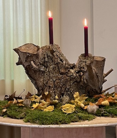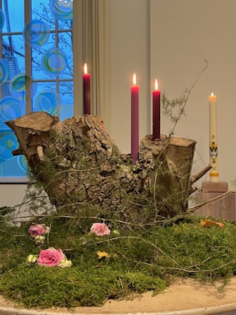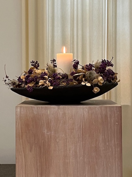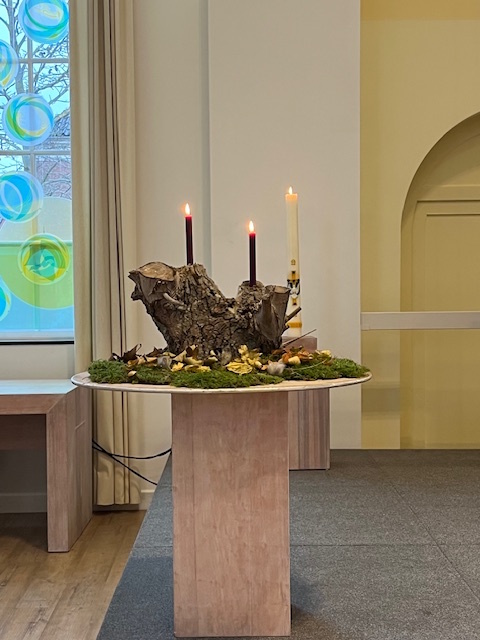 Met Advent en Kerst maakt Jeannet Slob symbolische schikkingen bij de diensten.
