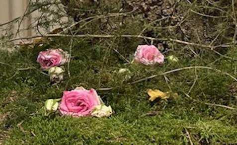 Tussen de lichtgroene tak, kleine roze roosjes op het mos.